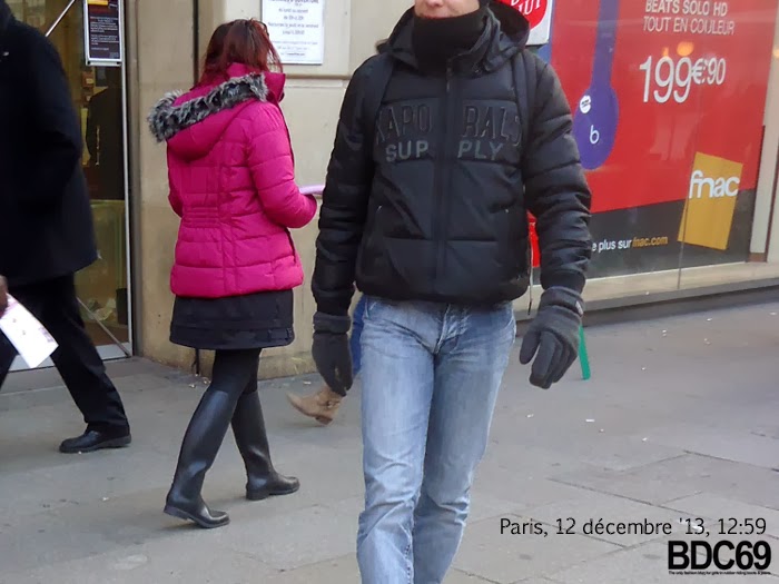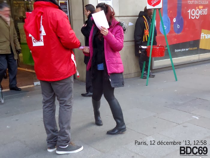 Un petit post encore montrant une fille en D4 travaillant à distribuer des bons de réduction pour Quick. Elle a sans doute oublié la veste au logo réglementaire que porte son collègue. Dixième jour sans pluie à Paris, 5°C; vu deux filles en bdc D4 également hier. Again a small post showing a girl working in Decathlon riding boots distributing discount coupons for Quick fast food restaurants. Tenth dry day in Paris, 5°C.