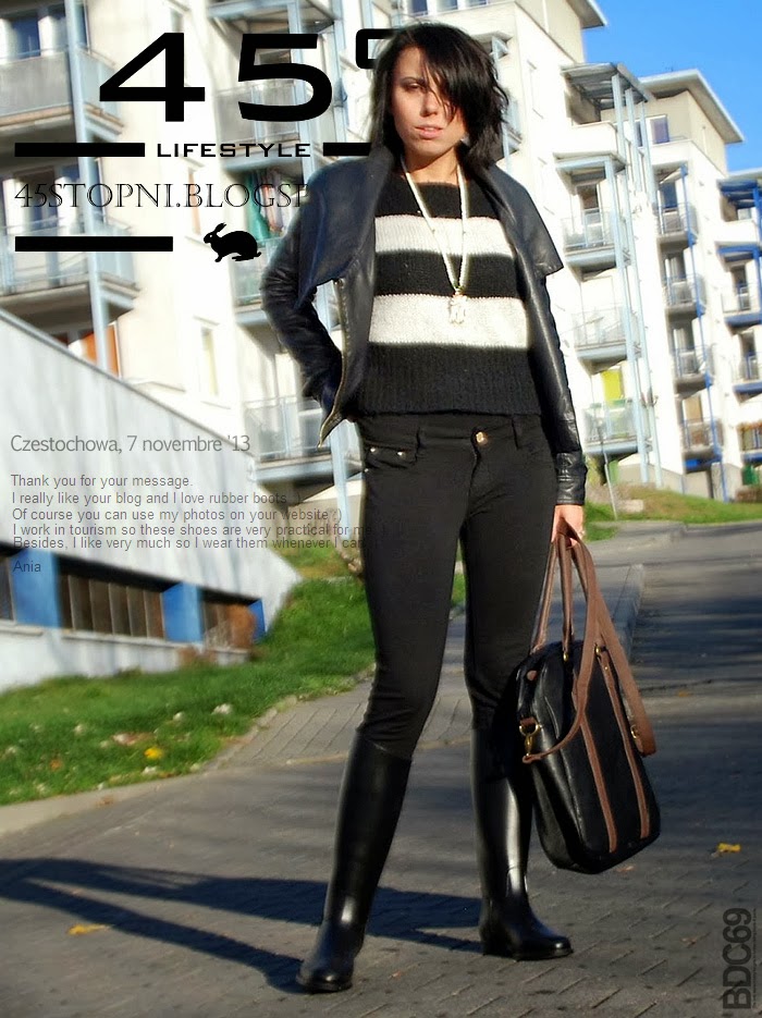 - http://www.vanillalipstick.com/2011/11/autumn-rush.html Again a pretty Czech, they are really friendly, in studded rubber riding boots again, as Tereza. A very successful again. There is another equally interesting here or there. A very pleasant blog to check. 2013 is the year of this trend in Prague.- http://45stopni.blogspot.fr/2013/11/kaloszki.html Ania, de Pologne, considère d'abord ses bottes comme des bottes d'équitation qu'elle utilise comme des bottes de pluie. Un total look déjà vu mais qui porté à la façon d'Ania a beaucoup de style: un slim superbe au lieu d'un legging fade, un pull rayé de blanc avec un pendentif blanc, un blouson en cuir noir. Bravo Ania! Elle m'écrit qu'elle les porte dès que possible et notament pour son boulot, elle bosse dans le tourisme. Son blog est principalement accès sur les produits de beauté.